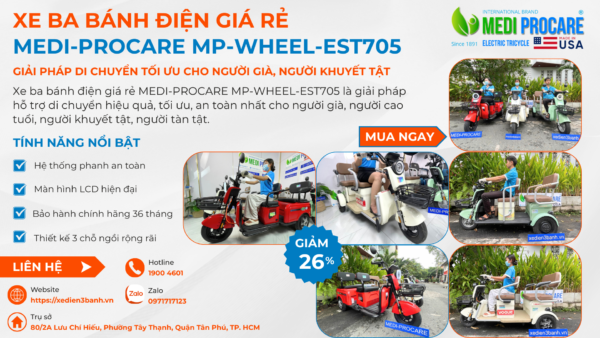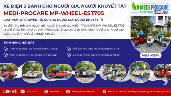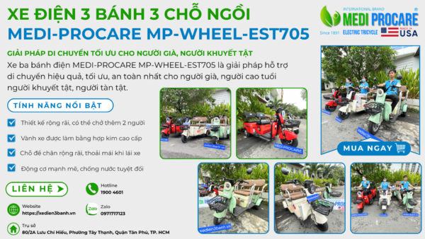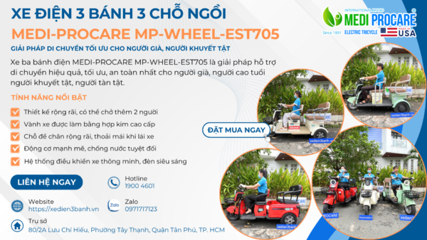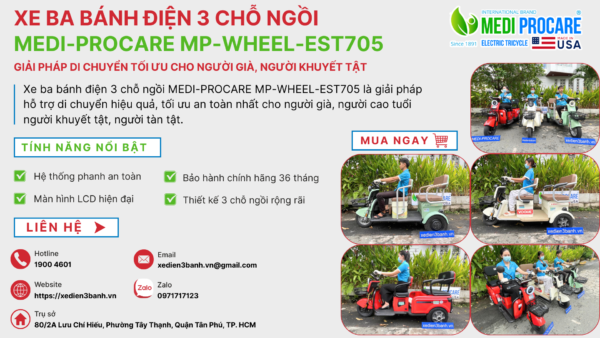 Xe điện 3 bánh MEDI-PROCARE MP-WHEEL-EST705 là một trong những sản phẩm nổi bật, đáp ứng nhu cầu di chuyển của người già, người khuyết tật, và những người cần hỗ trợ di chuyển đặc biệt.