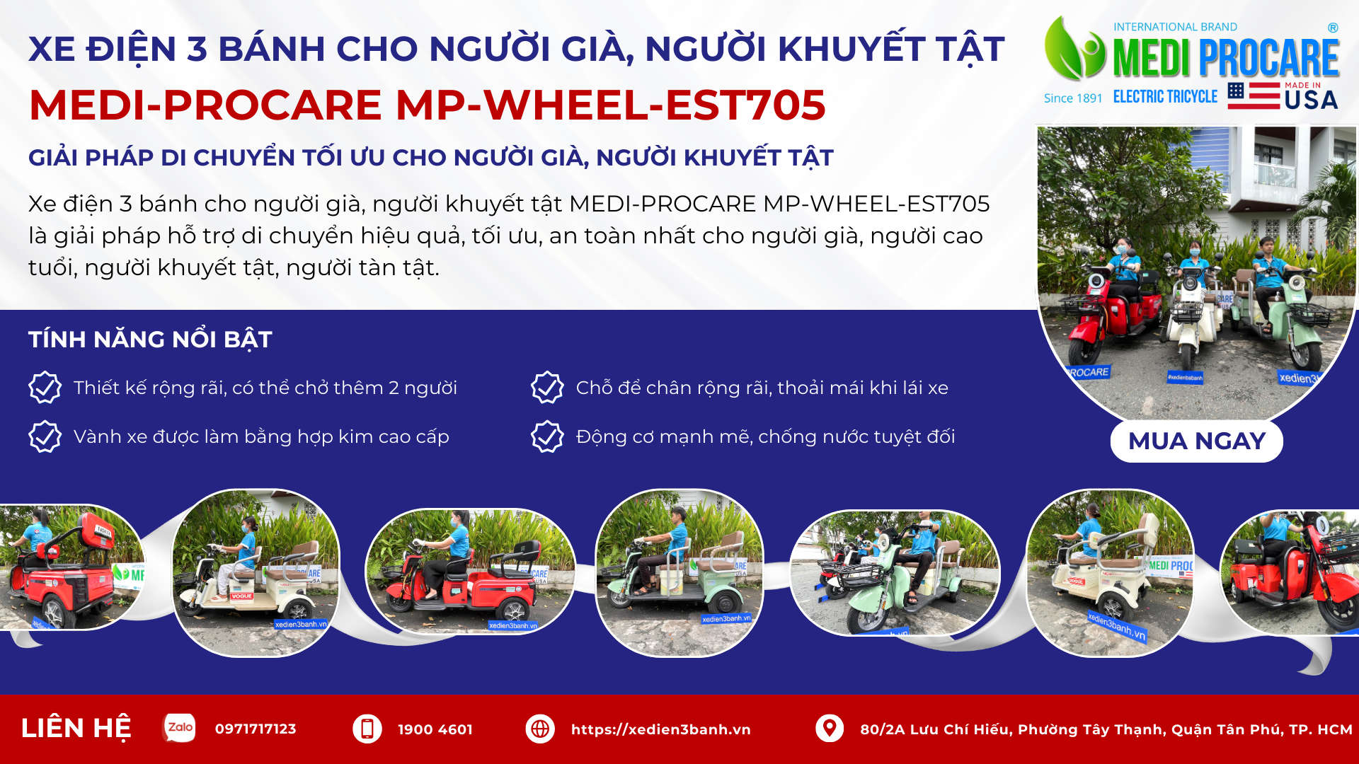 Xe điện ba bánh MEDI-PROCARE MP-WHEEL-EST705 là sự lựa chọn hoàn hảo cho những ai đang tìm kiếm một phương tiện di chuyển an toàn, tiện lợi và hiệu quả, đặc biệt là đối với người già và người khuyết tật. Với chất lượng vượt trội, công nghệ hiện đại và giá thành hợp lý, sản phẩm hứa hẹn sẽ đáp ứng đầy đủ nhu cầu di chuyển của Quý khách hàng. Hãy lựa chọn MEDI-PROCARE để trải nghiệm sự khác biệt!